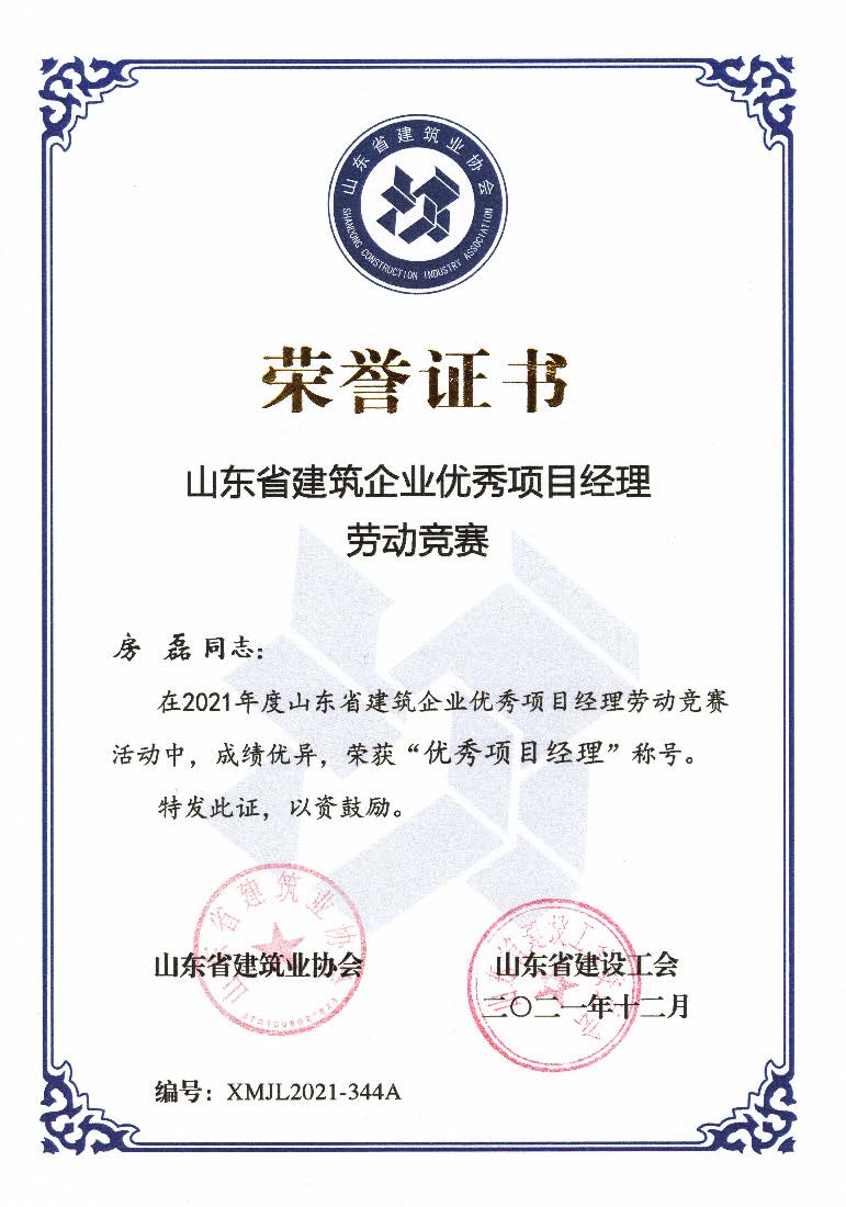 在山東省建筑業(yè)協(xié)會和山東省建設工會組織的2021年度山東省建筑企業(yè)優(yōu)秀項目經理勞動競賽活動中,我公司王勇同志和房磊同志獲評山東省建筑企業(yè)“優(yōu)秀項目經理”稱號。