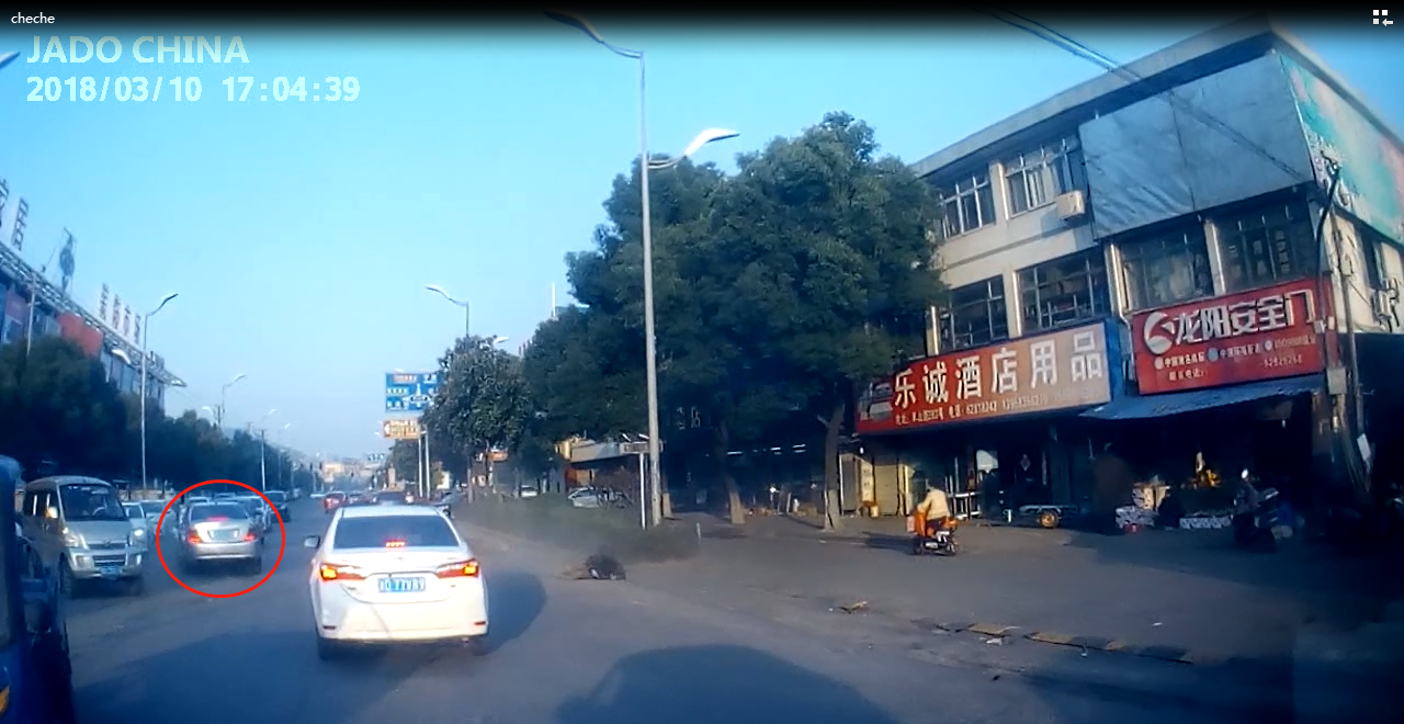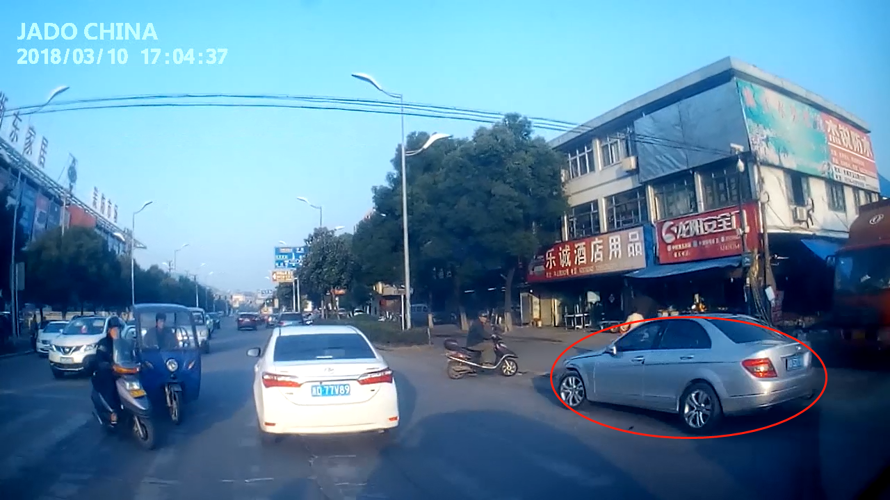 視頻中顯示,一輛銀色汽車(chē)迅速地撞向前方橫穿馬路的電瓶車(chē),在急打左轉(zhuǎn)向盤(pán)的時(shí)候,沖向反向車(chē)道又撞上一輛面包車(chē),造成二次傷害,整個(gè)過(guò)程被捷渡車(chē)主安裝的D720行車(chē)記錄儀記錄了下來(lái)。