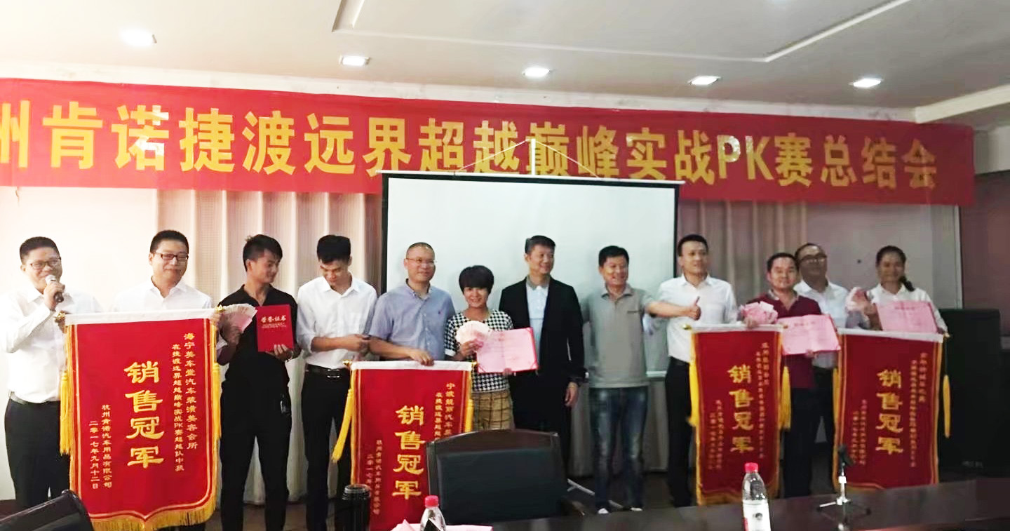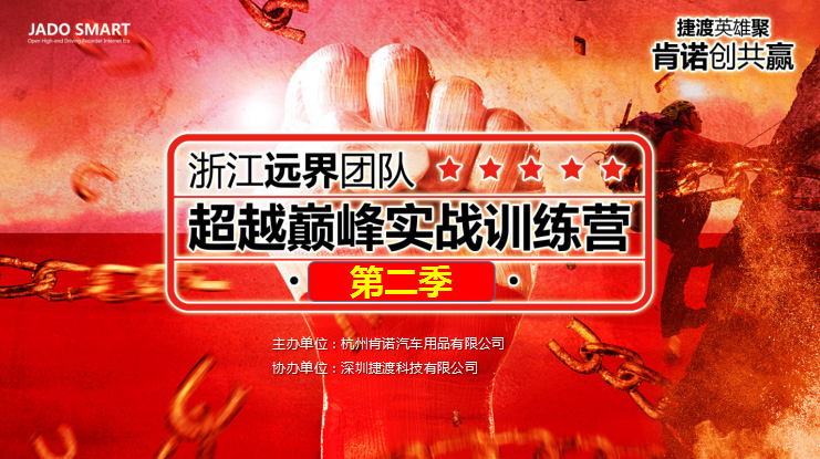 2017年9月12日,杭州肯諾汽車(chē)用品有限公司攜手JADO捷渡智能(中國(guó)),舉行了“捷渡英雄聚,肯諾創(chuàng)共贏”浙江遠(yuǎn)界團(tuán)隊(duì)超越巔峰實(shí)戰(zhàn)訓(xùn)練營(yíng)PK賽總結(jié)大會(huì)。JADO捷渡智能(中國(guó))華東戰(zhàn)區(qū)總監(jiān)杜新先生、杭州肯諾汽車(chē)用品有限公司總經(jīng)理徐善振先生,以及各優(yōu)秀終端門(mén)店店長(zhǎng)參加了本次總結(jié)會(huì)。
