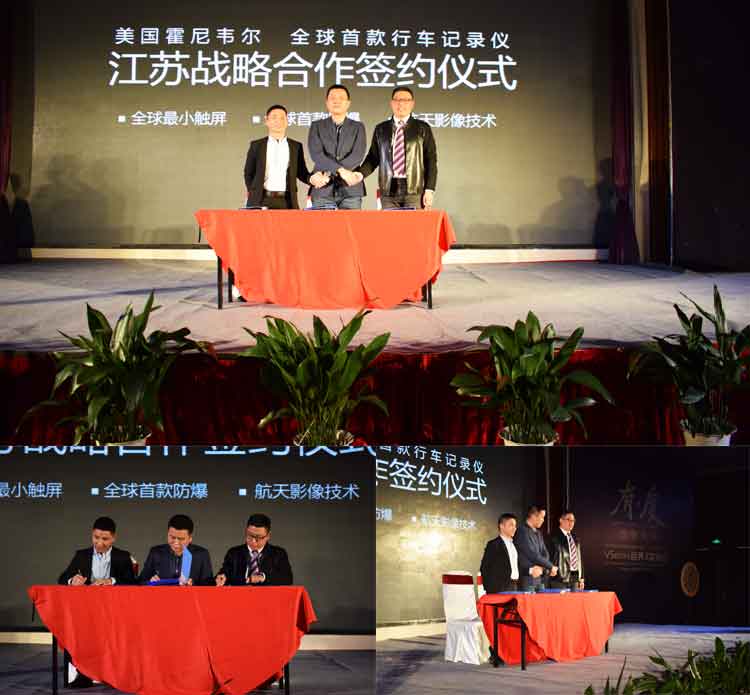 JADO捷渡智能(中國(guó))營(yíng)銷中心總經(jīng)理陳問(wèn)文先生與揚(yáng)州天泓汽車貿(mào)易有限公司總經(jīng)理施德春先生、蘇州天通汽車服務(wù)有限公司總經(jīng)理周林海先生進(jìn)行了霍尼韋爾行車記錄儀在江蘇地區(qū)的簽約授權(quán)儀式,這標(biāo)志著霍尼韋爾行車記錄儀開(kāi)啟了江蘇區(qū)域市場(chǎng)。