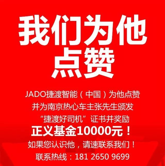 JADO捷渡智能(中國)為提供證據(jù)的張先生點贊,為他的中國心、正義感點贊!同時將為張先生頒布“捷渡好司機(jī)”證書,并獎勵正義基金1萬元!