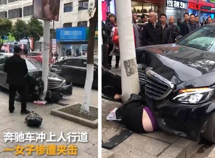 不少行人正在人行道上行走,一輛黑色奔馳車突然躥到人行道上撞倒一名女性行人,隨后撞上路燈桿才停下來(lái)。