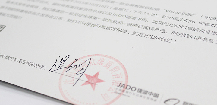 2015年10月16日,以 “改變成就未來” 為主題的“JADO捷渡中國智能后視鏡遠界系列(中國.遼寧)發(fā)布會暨戰(zhàn)略合作簽約儀式”,在中國沈陽榮富大酒店完美落幕。