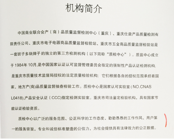 中國商業(yè)聯(lián)合會產(chǎn)(商)品質(zhì)量監(jiān)督檢測中心(重慶)、重慶仕益產(chǎn)品質(zhì)量檢測有限責(zé)任公司、重慶市電子電器商品質(zhì)量監(jiān)督檢驗站、重慶市五金商品質(zhì)量監(jiān)督檢驗站是一套班子多塊牌子的獨立的第三方檢測機構(gòu)(以下簡稱“質(zhì)檢中心”)。質(zhì)檢中心成立于1984年10月,是中國國家認(rèn)證認(rèn)可監(jiān)督管理委員會指定的強制性產(chǎn)品認(rèn)證檢測機構(gòu),是重慶市質(zhì)量技術(shù)監(jiān)督局授權(quán)的法定質(zhì)量檢驗機構(gòu),他們根據(jù)各自的授權(quán)范圍承擔(dān)著國家、地方產(chǎn)(商)品質(zhì)量監(jiān)督抽查檢驗工作。質(zhì)檢中心是國家認(rèn)可實驗室(NO.CNASL 0418)、產(chǎn)品安全認(rèn)證(CCC)指定檢測實驗室。重慶市司法鑒定檢驗機構(gòu),具有國家節(jié)能認(rèn)證檢驗資質(zhì)。質(zhì)檢中心以專業(yè)和誠信標(biāo)準(zhǔn)塑造的公信力,為社會提供具有法律效力的公正數(shù)據(jù)。