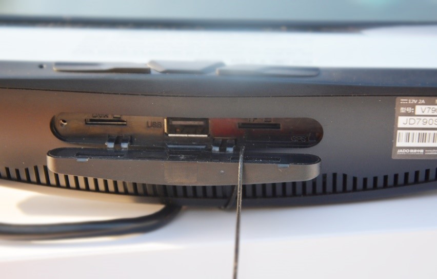 底部分布的有散熱孔,同時(shí)個(gè)DVR卡槽,USB接口,TF卡槽,GPS卡槽也位于底部。其中TF卡槽插入儲(chǔ)存卡,就能是使用行車記錄儀后保存數(shù)據(jù)。